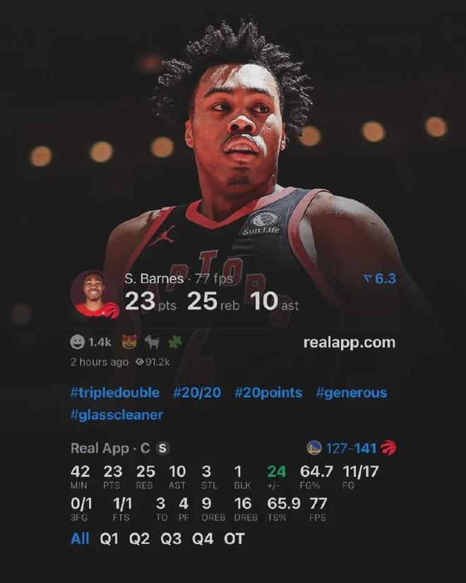 殺瘋了,巴恩斯徹底殺瘋了,擔任首發中鋒位置,出戰約42分鍾,投籃17中11,高效狂轟23分25板(9前場板)10助超級三雙數據外加3斷1帽進賬,帶領猛龍加時賽141-127擊敗勇士。