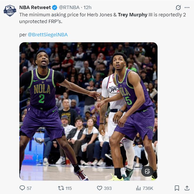 北京時間1月7日晨,根據NBA記者BrettSiegel的報道,鵜鶘隊對墨菲的要價是兩個不保護的首輪簽。(此前金州勇士隊已經跟新奧爾良鵜鶘隊探討過關於墨菲的交易)