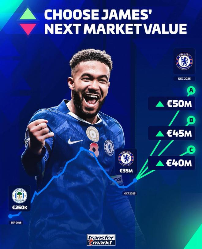 德轉將在12月9日對英超球員的身價進行更新,今日德轉預熱切爾西後衛裏斯-詹姆斯身價,最低漲至4000萬歐,最高漲至5000萬歐。